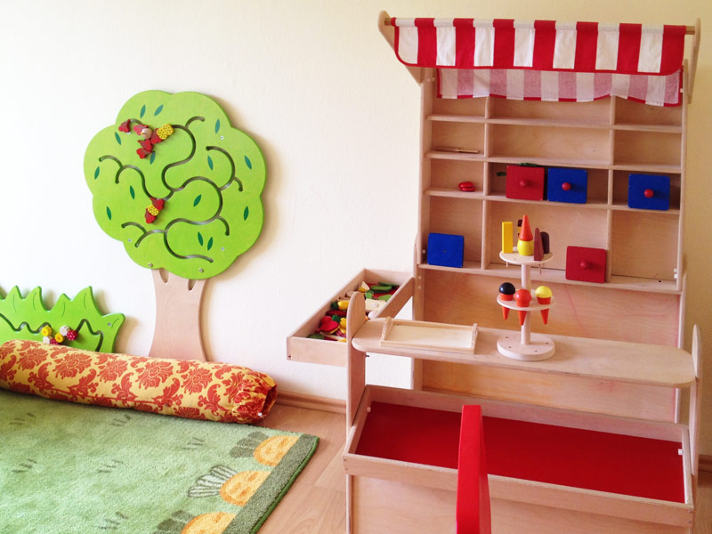 Drinnen haben wir jede Menge Bein- und Kopffreiheit für alles, was Kinderherzen höher schlagen lässt: Bücher und Geschichten-CDs für spannende Reisen durch die Fantasie, zahlreiche Musikinstrumente, um mit dem richtigen Ton anzugeben, millionenhundert Malstifte, Buntpapiere, Bastelbögen … und Spielzeug – vom Püppchen bis zum Plesiosaurus, vom bösen Ritter bis zur guten Fee.